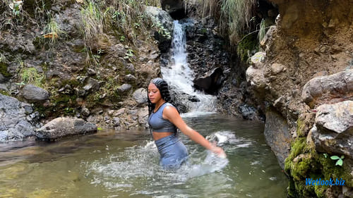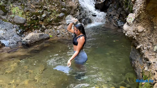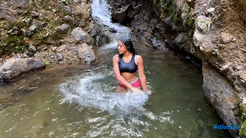 Alla enjoys a refreshing moment in a mountain stream surrounded by rocky cliffs and mossy stones. Wearing her sporty outfit, she steps into the cool water, letting the flow from the small waterfall soak her completely. Her wet clothes shimmer under natural light, blending perfectly with the peaceful outdoor setting. This session captures the essence of natural wetlook — casual, pure, and full of life.