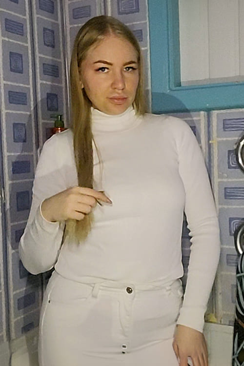 Danielle steps into a tiled bathroom space wearing a fitted white turtleneck top and high-waisted white pants, creating a clean, minimalist look before the transformation begins. The soft fabric hugs her silhouette while the neutral tones highlight every detail once water touches the material.
