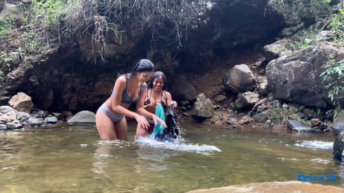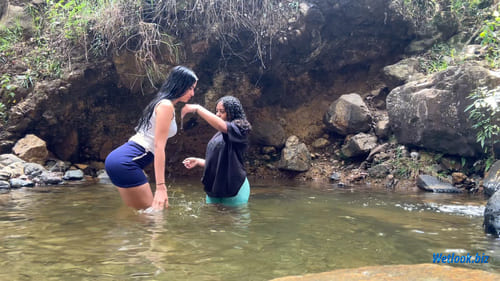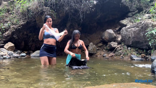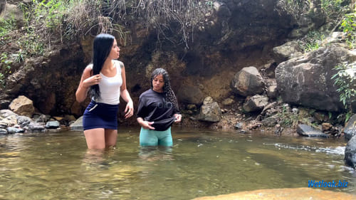 This outdoor wetlook set captures two women enjoying a refreshing river moment in a natural rocky stream. Surrounded by stones, greenery, and flowing water, the session focuses on real interaction, movement, and the visual transformation of outfits as they become fully soaked.