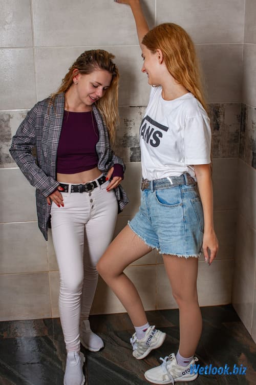 This wetlook group set captures a natural shower moment where casual outfits gradually become fully soaked under running water. Two models interact in a relaxed bathroom environment, starting in dry everyday clothing and moving step by step into a completely wet look. Water flows over tops, jackets, jeans, and shorts, creating realistic fabric textures, transparency effects, and authentic reactions.