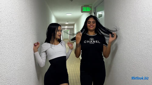 The scene continues inside the shower, where water flows freely over everyday outfits. Hair becomes heavy with water, shirts and tops turn translucent, and casual clothing transforms under the stream. The interaction is natural, playful, and realistic — no acting, no posing, just genuine reactions to water.