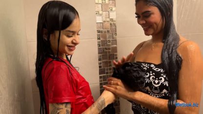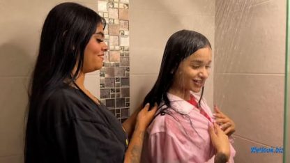 Two girls share a joyful shower moment fully dressed. One wears a bright red top with a pink shirt, while the other joins in her stylish black outfit. They laugh as the water slowly soaks their clothes and hair, enjoying the playful and spontaneous wetlook experience. The scene captures natural emotions, close friendship, and the beauty of water-soaked fashion in motion. A refreshing and cheerful set for true wetlook fans!