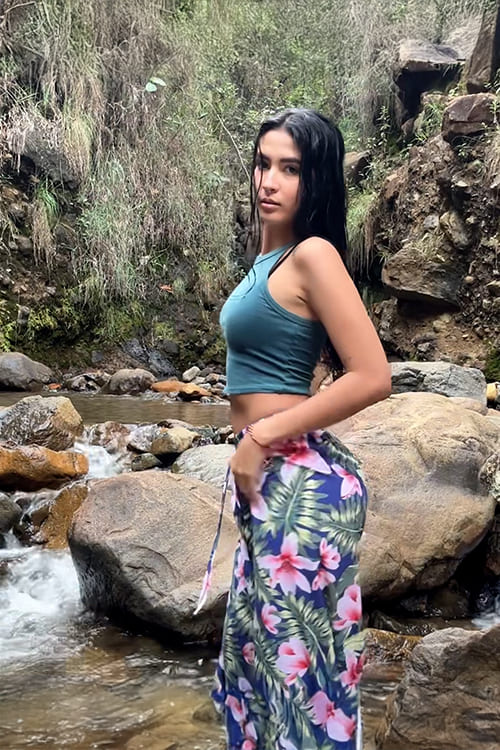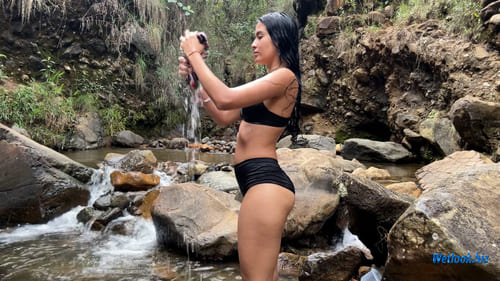 Pamela explores a peaceful river canyon, surrounded by rocks, flowing water, and untouched nature. The session begins with her stepping into the stream in a simple black outfit, her hair and skin slowly becoming soaked by the cold river water.