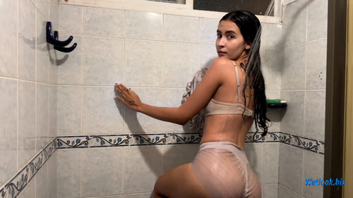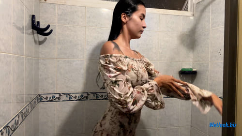 Pamela steps into the shower wearing a soft floral off-shoulder dress that instantly transforms as the water flows over it. The light fabric becomes glossy and form-fitting, revealing beautiful wet textures and gentle folds that cling to her silhouette. She enjoys the warm water while her long dark hair turns sleek and shiny, adding even more elegance to the scene.