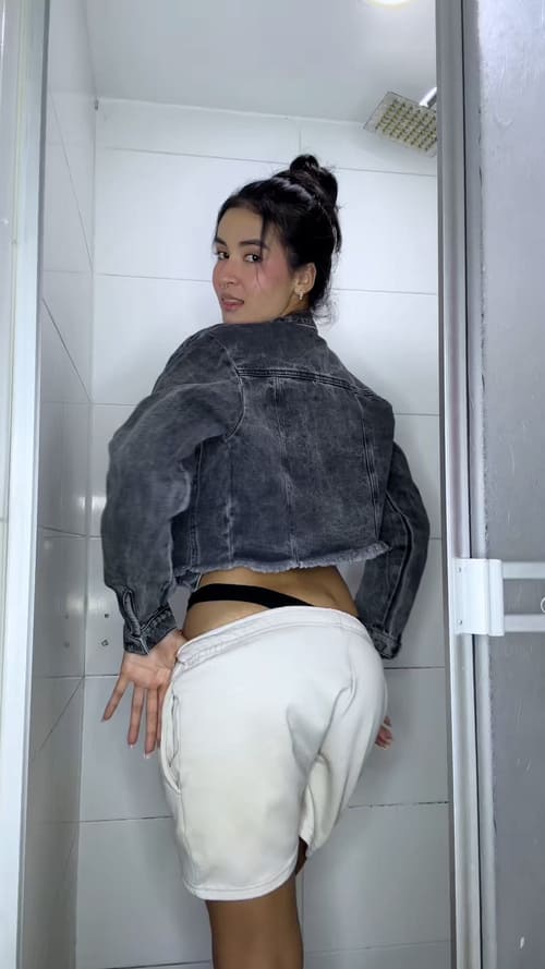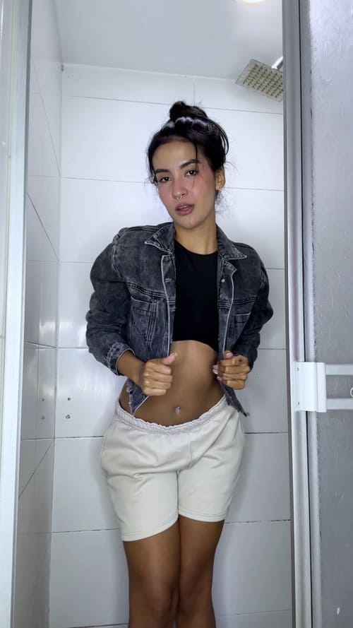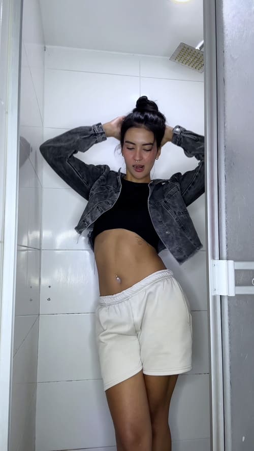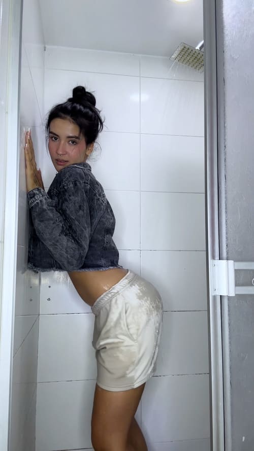 Pamela brings a playful and fresh vibe to this shower wetlook session. She steps into the narrow shower wearing a cropped denim jacket, a black top and soft beige shorts, slowly letting the water soak the outfit piece by piece. The transformation begins as the fabric darkens and clings to her shape, creating a smooth wet sheen that highlights every movement.