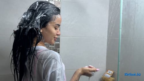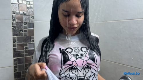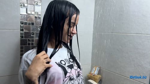 The session then transitions into the shower, where the white t-shirt with a bold graphic print slowly becomes soaked under the running water. The fabric clings naturally to her body, turning semi-transparent as it absorbs the water. Droplets run down her hair and shoulders while the material darkens and defines every contour.