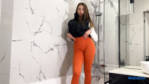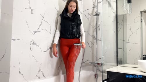 This wetlook set captures a modern shower experience where everyday fashion meets water and movement. The model starts in a clean bathroom environment wearing a fitted white top and bright red leggings, gradually becoming soaked under running water. As the fabric absorbs water, textures change, colors deepen, and the outfit clings naturally, creating a visually striking wetlook effect.