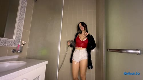 Valery steps into the shower in a casual summer outfit — a bright red top, white denim shorts and a loose black hoodie.
