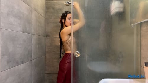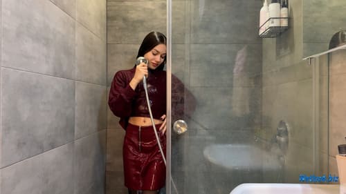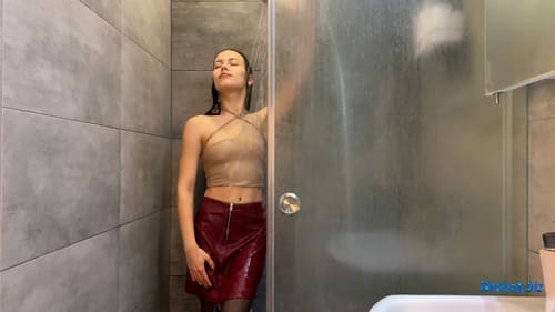 Inside a modern tiled shower, water slowly transforms the look. The burgundy fabric darkens, clings to her body, and reflects the light as it becomes soaked. Vanessa confidently uses the handheld shower, letting water run over her outfit, emphasizing the texture and movement of wet clothes.