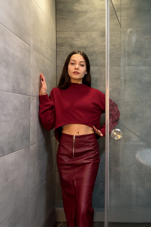 Vanessa starts this wetlook session fully dressed, wearing a deep burgundy cropped sweatshirt with long sleeves and a matching high-waisted skirt with a front zipper. The outfit looks structured and stylish while completely dry, creating a strong contrast with what follows.